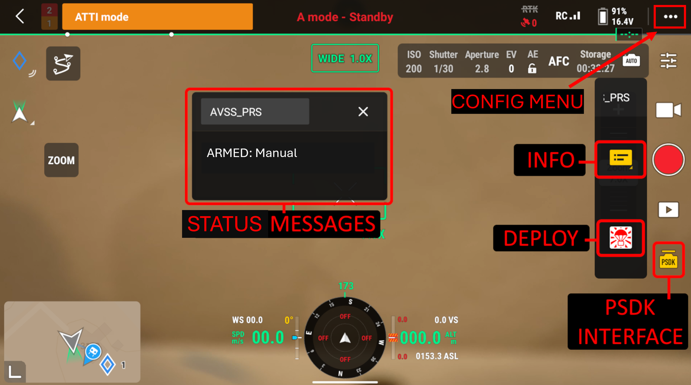 The PSDK interface will show the AVSS PRS-M4DT user interface. This will allow access to the INFO screen for information on the PRS-M4DT, as well as the MTD function of the Drone transmitter. The Icon will appear white until the user clicks the icon. This will activate the PSDK window, and turn the icon yellow.