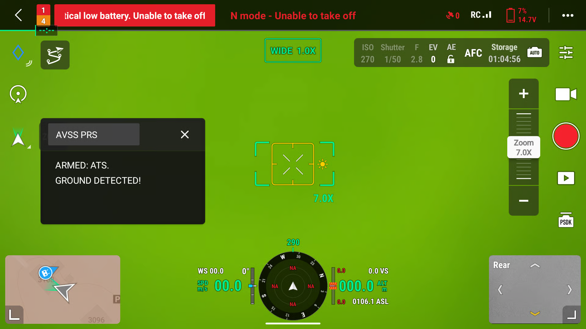 IF THE GROUND DISTANCE SENSOR DETECTS A DISTANCE ABOVE GROUND OF LESS THAN OR EQUAL TO 5 METERS, THE PARACHUTE WILL BE TEMPORARILY DISABLED AND WILL NOT TRIGGER. NOTE: THIS CAN OCCUR IF FLYING DIRECTLY ABOVE A BUILDING, TREE, OR OTHER OBSTACLE WITHIN 5 METERS. THE PSDK TEXT WINDOW WILL SHOW "GROUND DETECTED!" BUT THIS DOES NOT MEAN THAT THE PARACHUTE WILL BE DISARMED. VERIFY THAT THE PSDK WINDOW DISPLAYS "DISARMED" BEFORE APPROACHING THE DRONE.
